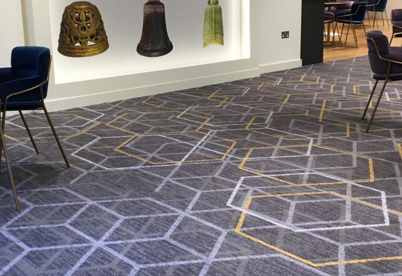 The décor of the venue consists of modern colourful furniture, stimulating artwork and contemporary design. Our carpets needed to also make a splash. The Newhey design team created a highly distinctive bespoke bold geometric design in warm purply greys with rich mustard yellow highlights.